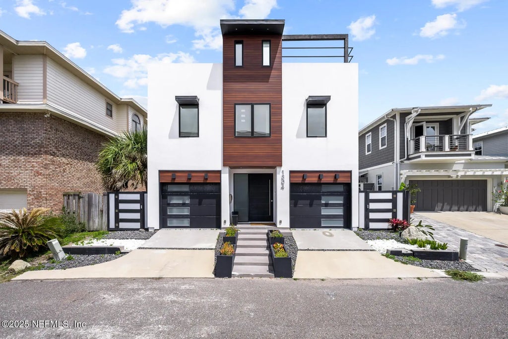 This oceanfront home in Neptune Beach offers breathtaking panoramic ocean views and sleek, modern interiors. Designed for the discerning buyer, the residence showcases contemporary style with meticulous attention to detail throughout. Ideally located just a short walk from the vibrant Beaches Town Center, it offers the perfect blend of tranquility and convenience. Enter through an impressive 8' pivot door into a dramatic foyer featuring a floating staircase that sets the tone for the home's architectural elegance. The main level includes a luxurious master suite with a spa-like bathroom, complete with a soaking tub, dual vanities, and a spacious walk-in closet. Upstairs, the open-concept living space centers around a gourmet kitchen outfitted with Dolomite and granite countertops, top-tier appliances, and custom cabinetry—ideal for both everyday living and entertaining. Expansive windows flood the living and dining areas with natural light and showcase stunning, unobstructed ocean views. Step outside to enjoy a fully furnished rooftop deck, perfect for taking in the sea breeze or hosting guests in style. Recent upgrades include two new HVAC units, offering enhanced comfort and efficiency, and artificial turf in the backyard, creating a low-maintenance, green outdoor space year-round. With high-end finishes, smart home automation, and a location that places you steps from dining, shopping, and the sand, this home sets a new standard for oceanfront luxury living.