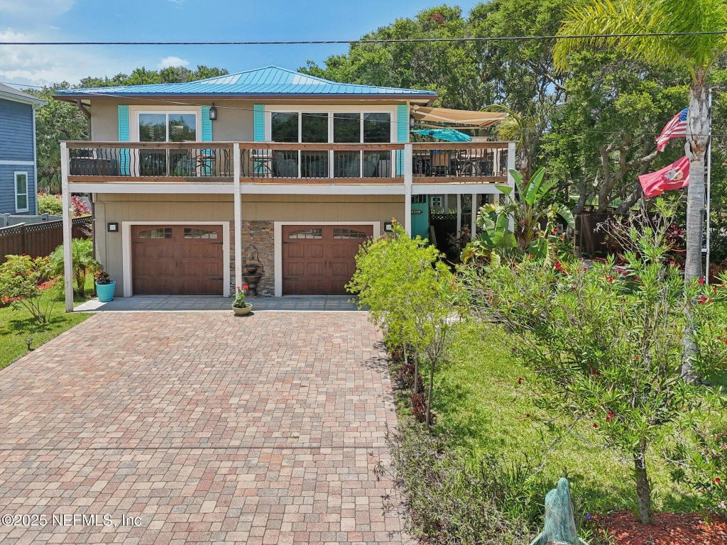 Just a 4-minute walk to the ocean, this coastal retreat blends natural beauty with thoughtful design. The main residence offers 3 bedrooms, 2 baths, and bright, open living spaces with new sliding glass doors leading to a spacious deck shaded by a retractable awning—perfect for relaxing among the oaks or taking in Vilano Bridge views. Inside, enjoy a chef's kitchen with stainless steel appliances, updated bathrooms, and flexible guest rooms for work, art, or visitors. The primary suite opens to the deck and features a walk-in shower with dual stone sinks. Downstairs, a one-of-a-kind nautical-themed lounge with custom bar, porthole window, and access to a screened patio sets the stage for entertaining. Step outside to landscaped grounds with paver walkways, fire pit, and multiple gathering spaces. A large shed offers bonus storage or workshop potential. This ''Tree House'' is truly designed for easy beachside living and entertaining.