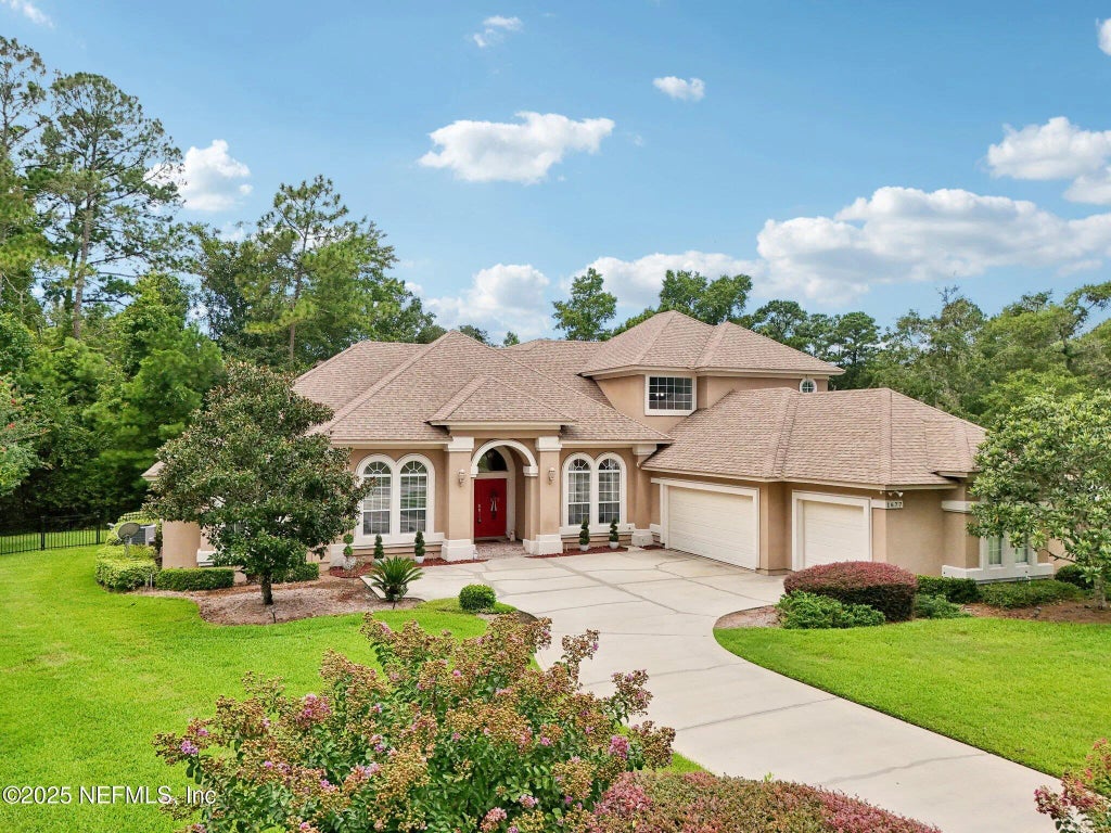 Custom-Built Home with Flexible Layout & Designer Finishes. This thoughtfully designed quality built home offers a versatile floor plan ideal for growing families or multi-generational living, with potential for private split quarters. From the moment you arrive you'll be impressed by the inviting courtyard entrance and oversized 3-car garage featuring a large storage closet and dedicated space for your golf cart. Step inside to discover a layout that showcases architectural excellence—from coffered ceilings and grand entrances to elegant niches, extensive crown molding and detailed trim throughout. The spacious main suite is a true retreat with a cozy sitting area and a luxurious en suite bath. The chef's kitchen features granite countertops and opens to expansive living spaces with tile flooring in all public areas and bathrooms. An upstairs second family room with a wet bar and private balcony offers the perfect spot to unwind or entertain. With generously sized bedrooms, a dedicated office and multiple flexible living areas, there's room for everyone to live and work comfortably. Quality construction and timeless upgrades make this home a rare find.