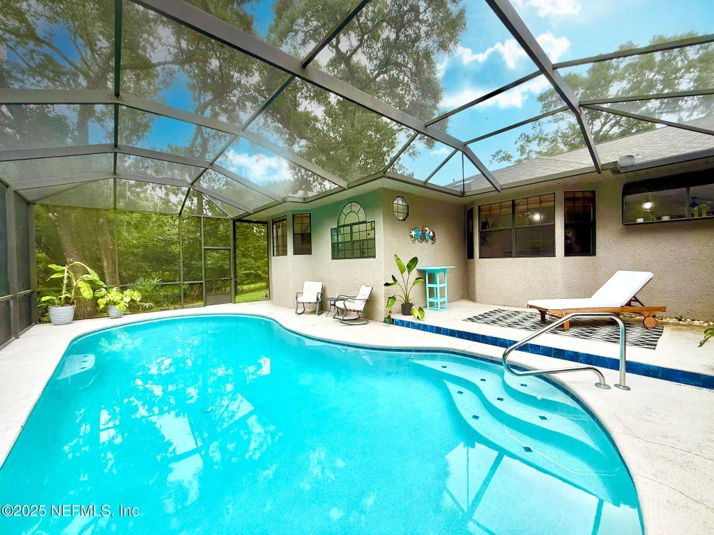 BEAUTIFUL 4/3 POOL HOME ON NEARLY AN ACRE! NO HOA! This amazing, open concept pool home has SO many incredible features! FULLY renovated, with stylish details, including thoughtfully curated tile, trendy wallpaper, a gorgeous kitchen (with all new appliances) and designer-style bathrooms—the primary bath featuring freestanding tub overlooking the pool! Tons of space and endless storage! Skylights, two-gar garage, separate shed out-building with garage door, plenty of parking & newly installed swing set. Other updates include new roof (2021), new AC (2025), new water treatment system (2023), tree removal and trimming, landscaping, new closet organization systems and ''drop zone'' added, new well and sprinkler system, new washer and dryer (2023), new laundry room cabinetry, new storm door (2025), office ship lap accent wall and septic inspected/cleaned (2023). Set on a large private lot, with a creek and surrounded by nature, this pool home has all the Florida vibes and more!