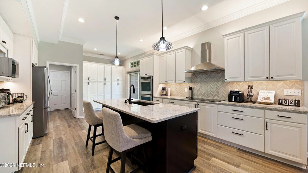 Welcome to this beautifully crafted custom home blending elegance, comfort, and functionality. The open floor plan features high ceilings, luxury vinyl plank flooring, and an abundance of natural light. The gourmet kitchen offers 42'' soft-close white cabinets, quartz countertops, herringbone backsplash, a large center island, and a KitchenAid stainless steel appliance package with double ovens. The split-bedroom layout provides privacy, and the cozy electric fireplace adds warmth to the living area. Electronic blinds throughout add modern convenience. Step outside to a peaceful screened lanai overlooking a tranquil lake and enjoy the serenity of nature right in your backyard. Whether you're relaxing, entertaining, or working from home, this well-maintained home has it all. Don't miss this rare opportunity to own a truly special property! All information pertaining to the property is deemed reliable, but not guaranteed. Information to be verified by the Buyer. Be advised that cameras may exist recording audio and video inside/outside the property, such as ring doorbells. Photos are digitally enhanced and could be altered, please verify.