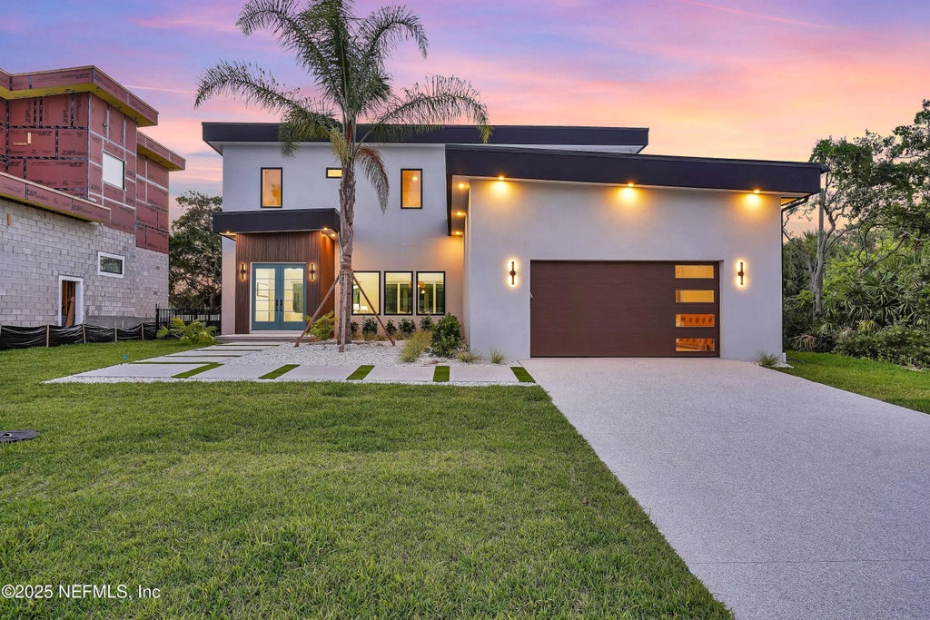 Welcome to 150 Morgan Avenue, a brand new 2025 custom-built modern home located in the desirable Surfside neighborhood of Vilano Beach. This thoughtfully designed residence offers over 3,200 square feet of refined coastal living with 4 bedrooms, 3.5 bathrooms and a spacious 2 car garage. Situated on a quiet dead-end street with no HOA, the property offers privacy, serenity, and marsh views. The home features two luxurious primary suites, one on the main floor and one upstairs, ideal for multi-generational living or guest accommodations. High-end finishes include concrete floors downstairs, engineered hardwood floors upstairs, and a premium stainless steel Bosch appliance package in the kitchen. Hurricane impact windows and doors provide security and peace of mind. Outdoor living is a highlight, with a heated saltwater pool, private putting green, summer kitchen and an outdoor shower, perfect for entertaining or relaxing after a day at the beach.
